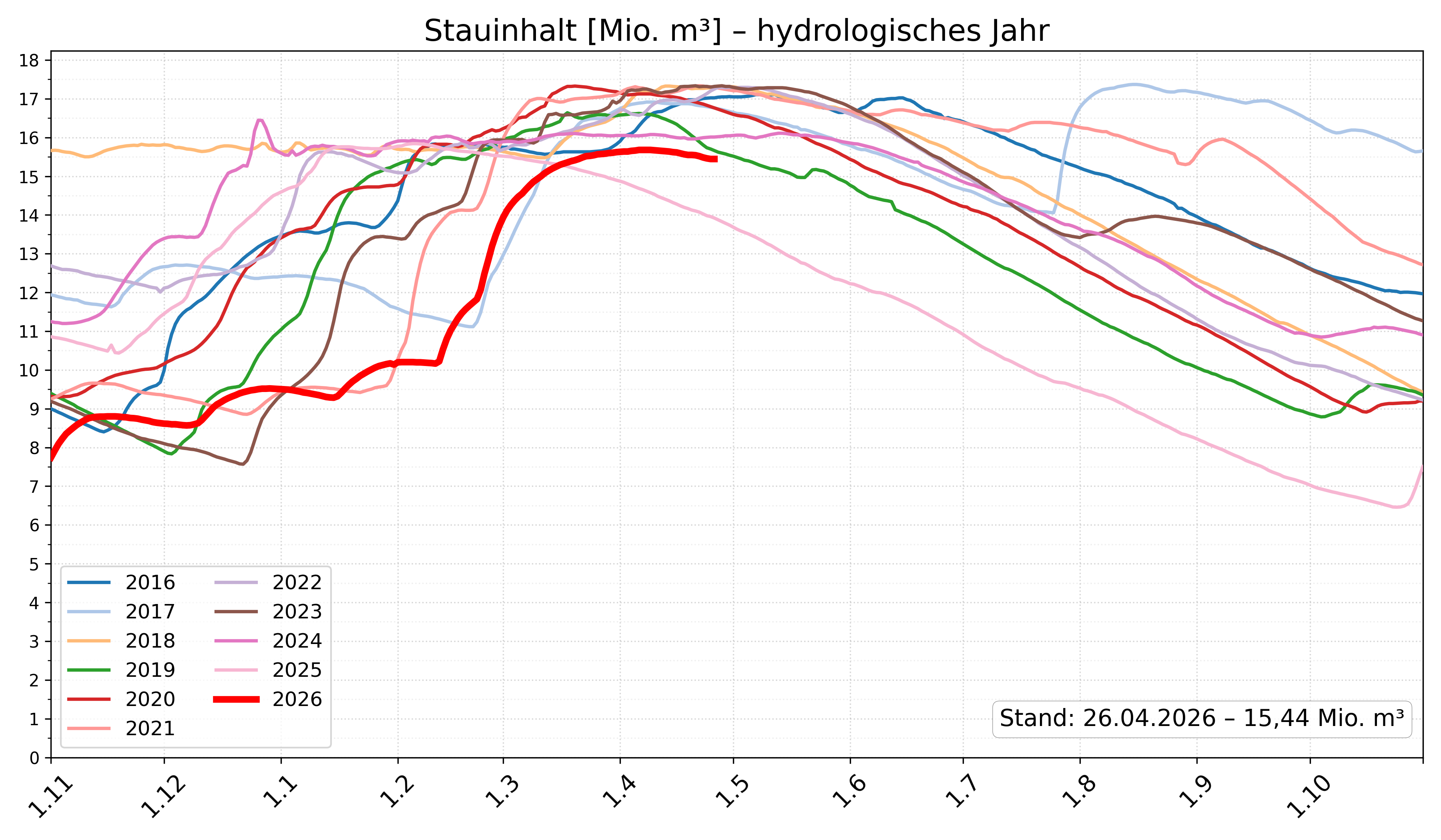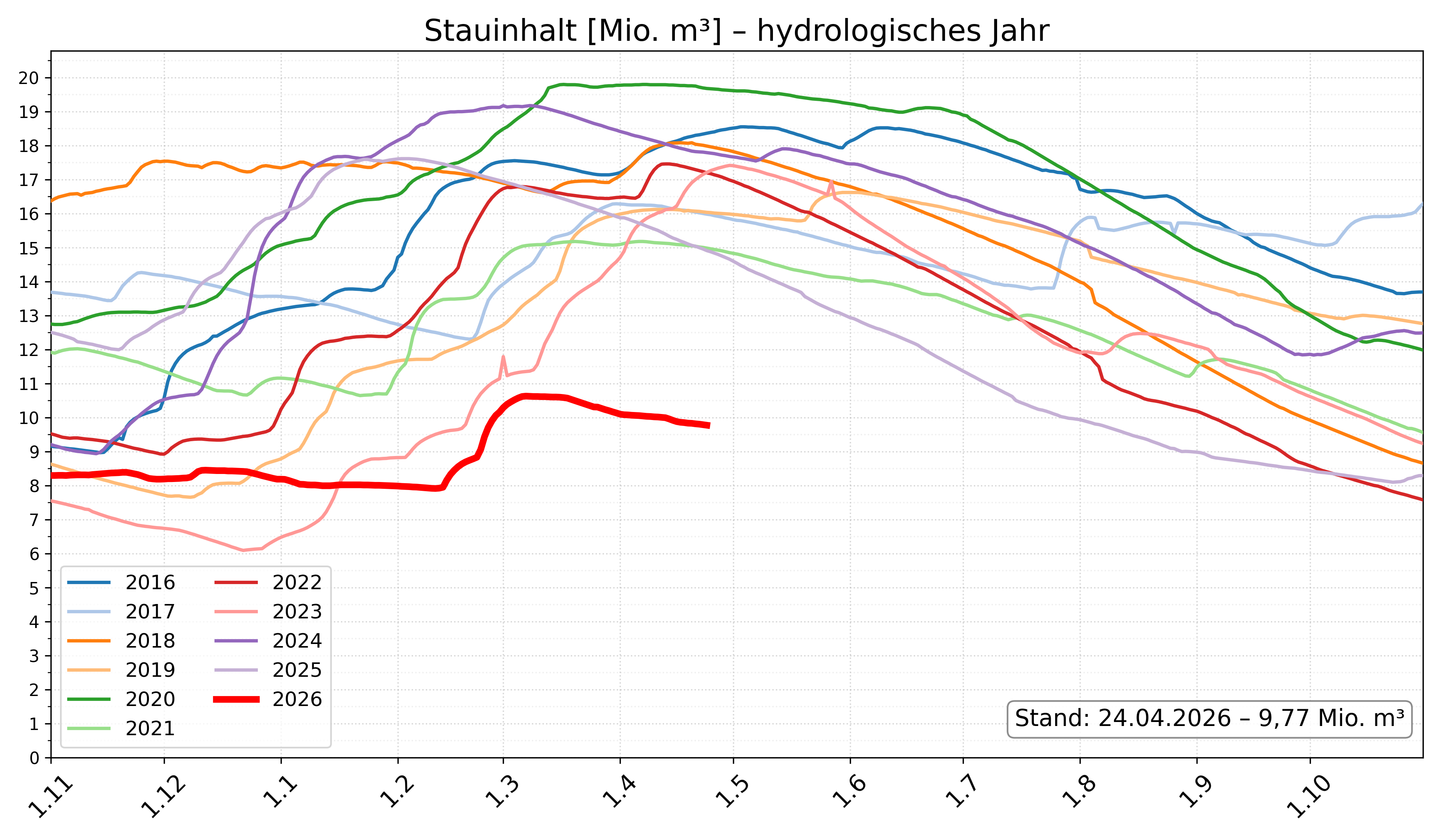 Entwicklung des Stauinhalts an der Talsperre Ohra im Vergleich zu den vergangenen 10 Jahren. Quelle: Thüringer Fernwasserversorgung -