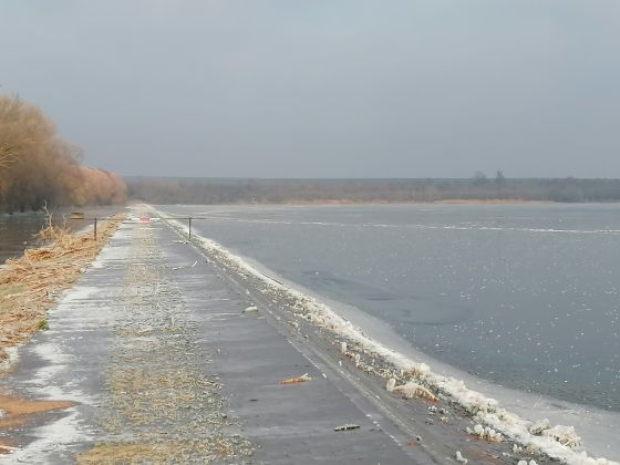 Erste Eisflächen links und rechts vom Nebendamm am Hochwasserrückhaltebecken Straußfurt. Foto: TFW/Hogh