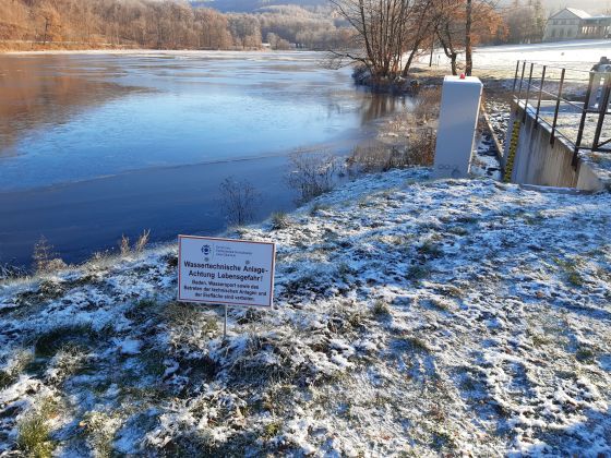 Mit den eisigen Temperaturen bilden sich mancherorts zauberhaft winterliche Landschaften. Einige der rund 120 Stauanlagen der Thüringer Fernwasserversorgung sind bereits mit einer leichten Eisschicht bedeckt und laden zu einem Spaziergang rund um die Stauanlagen ein. Die Thüringer Fernwasserversorgung warnt ausdrücklich davor, die Eisflächen zu betreten und weist auf die Warnschilder rund um die Stauräume hin. Spazierende aber auch der eigene Hund, der im Zweifel nicht selbst gerettet werden kann, sollten der Verlockung widerstehen und die knirschende Eisfläche nicht betreten. Die Stauanlagen sind auch kein Ort für das Schlittschuhlaufen. Die Gefahr, dass das Eis bricht, ist unabhängig von dessen Stärke an den Stauanlagen extrem hoch.