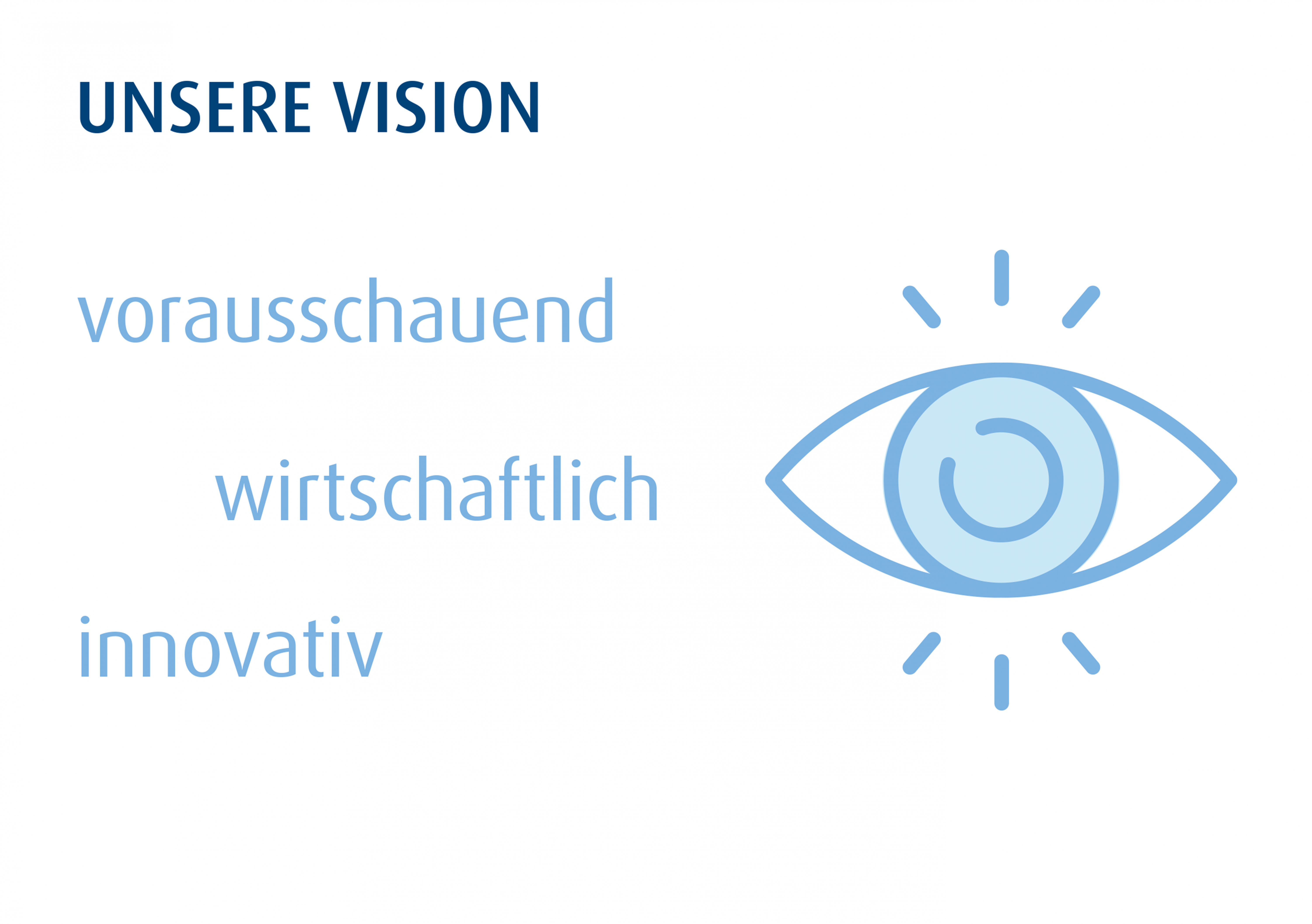 Unser Ziel ist es, Wasser als kostbare Lebensgrundlage zu sichern. Dafür entwickeln wir innovative und wirtschaftliche Lösungen für Versorgungssicherheit, Hochwasserschutz und Ressourcenschonung. Wir arbeiten als Team in einem attraktiven Arbeitsumfeld und gestalten durch eine vertrauensvolle Zusammenarbeit mit unseren Partnern und den Menschen in unserer Region eine lebenswerte Zukunft. Wir wollen durch vorausschauendes Management und
